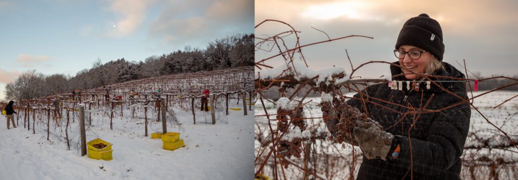 It was a cold, bright winter morning when we harvested our Ice Wine grapes—but spirits were high from the start. A fresh blanket of snow still covered the vineyard, just a week after a blizzard rolled through following Thanksgiving. The air was crisp, the sky clear, and the landscape unmistakably wintery in the best way.