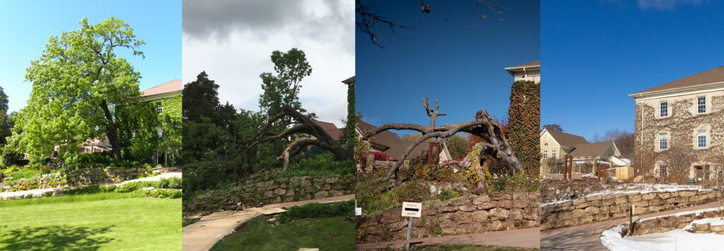 After nearly two centuries of growth, the oak tipped over in 2017, the result of its great age and an unusually wet spring that weakened the soil around its roots. Rather than removing it immediately, we supported the fallen tree so it could continue living in its new position — which it did for several years.